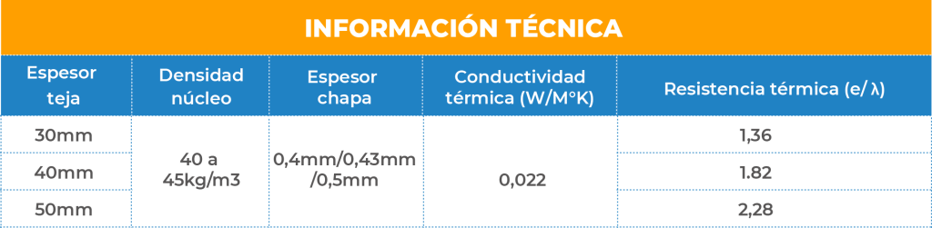 Es una cubierta térmica muy versátil, generalmente denominada como teja tipo sándwich, está compuesta por chapas galvanizadas prepintadas, en la parte superior de chapa trapezoidal y en la parte inferior plana color blanco, el núcleo es de espuma rígida de poliuretano de alta densidad.